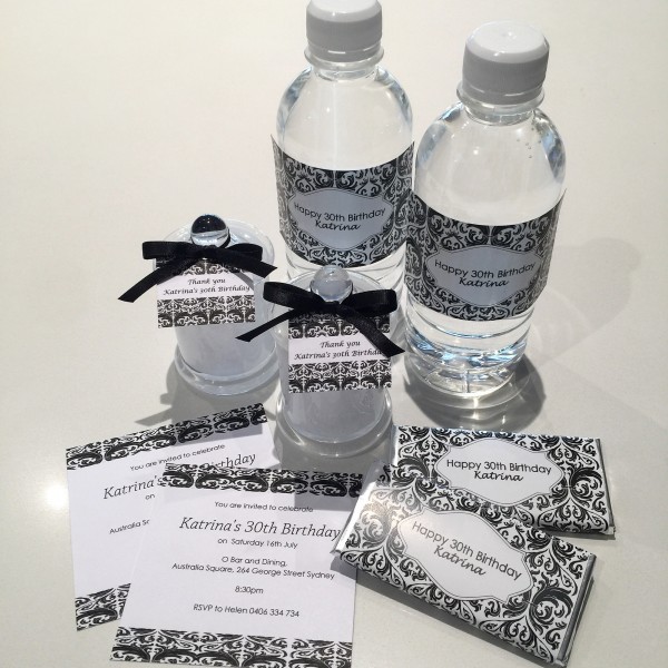 Several decorating options are available with matching designed bonbonniere & gifts: scented mini candles, chocolate bars and water bottles.