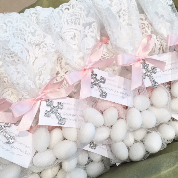 White lace bonbonniere bags with cross