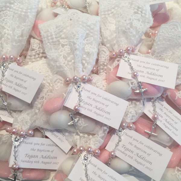 Seveal decorated options available and come with a customised thank you tag and filled with a mixture (x5) of white sugared almonds.