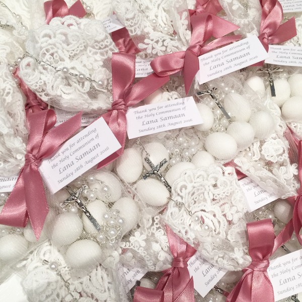 Decorated with one of our amazing full length rosary beads and filled with white sugared almonds.