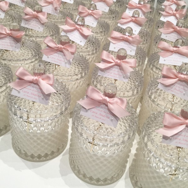 Clear candle bonbonniere with mini rosary